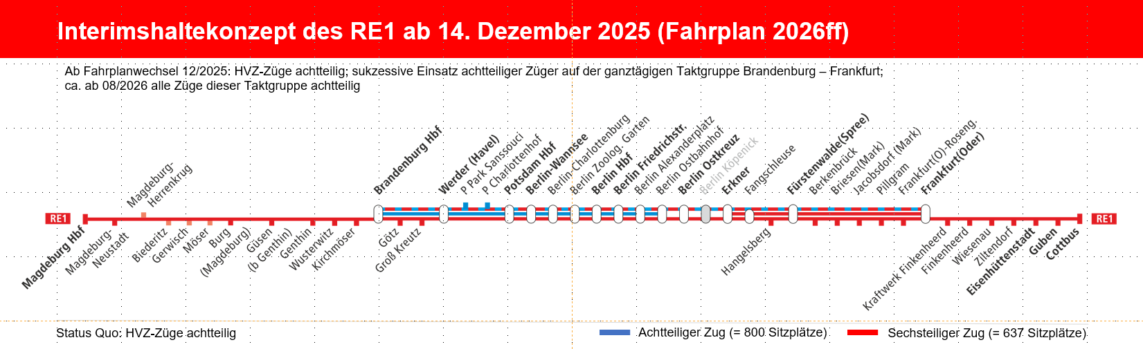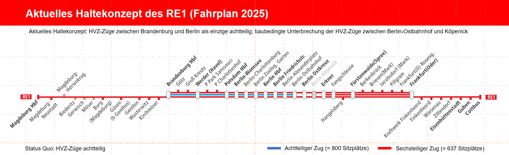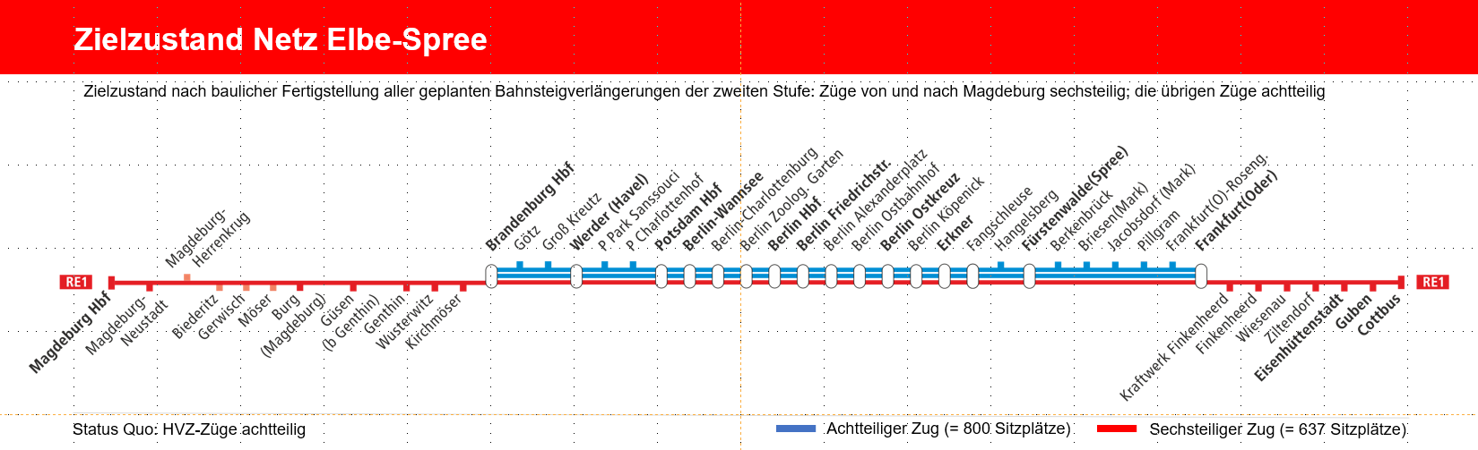 Der RE1 ist die am stärksten nachgefragte Regionalexpresslinie im VBB-Land und die zentrale Ost-West-Verbindung durch die Hauptstadtregion. Damit längere Züge mit deutlich mehr Sitzplätzen auf der Strecke fahren können, müssen die Bahnsteige in den kommenden Jahren an den steigenden Bedarf angepasst werden. Damit schaffen wir auf der Strecke mehr Komfort und Kapazität.